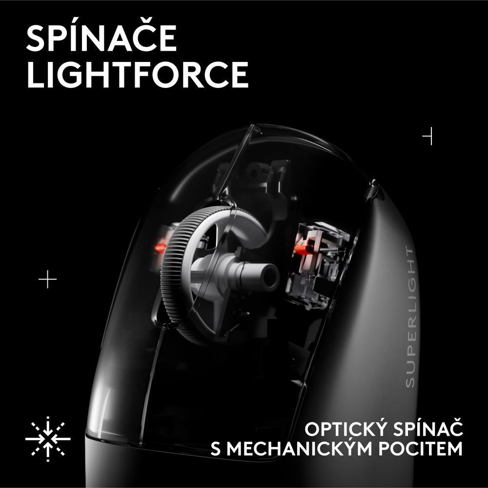 Herná myš – bezdrôtová, symetrická, optická, pripojenie cez Lightspeed a USB-C, citlivosť 44000 DPI, senzor Logitech Hero 2, odozva 0,5 ms, 5 tlačidiel, klasické koliesko, spínač Logitech Lightforce, bezdrôtový USB prijímač súčasťou balenia, rozmery 4 × 6,35 × 12,5 cm (V׊×H), hmotnosť 60 g